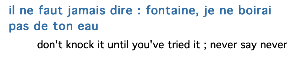 We have a french sentence : il ne faut jamais dire fontaine, je ne boirai pas de ton eau !