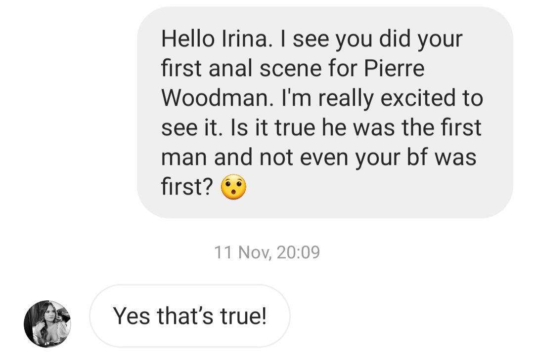Btw I said it was interesting because Irina had already told me on instagram before I was on the forum that Pierre was the 1st man to fuck her ass and not even her bf did it before him