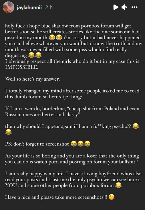 They post on their forum now a conversation between Pierre and Jayla in the Wunf where Pierre asks her if she want to try piss again like the first time they met or something like this and then they say she lied because of the picture she sent that nobody did it.