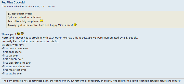 It is Pierre's decision what is the secret and what is not but I can tell you there are minimum half a dozen things I've never done before!!!niceice wrote:so, Mira can we get some clues what did you do first times in your submissive experience? It should not be TOP SECRET!!!!....![]()