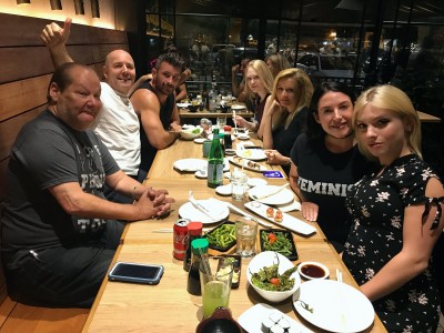 I am guessing that you are in a public restaurant in LA. So hundreds of possibilities. However movie stars would not have pink hair. I am guessing that it is a singer.