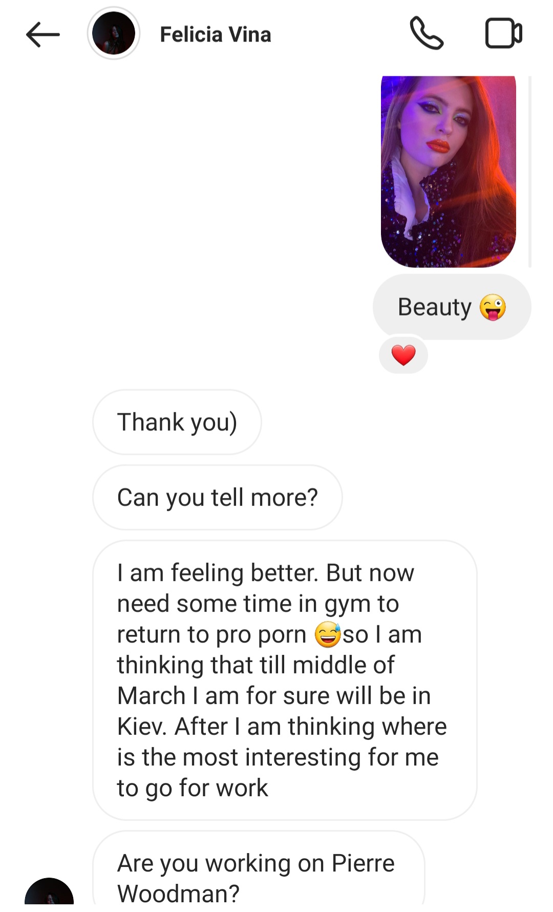 Felicia Vina is a Ukranian Girl. She said she is interested to work with Pierre but she was in hospital and had surgery recently so she will do a little gym before returning to porn in March.