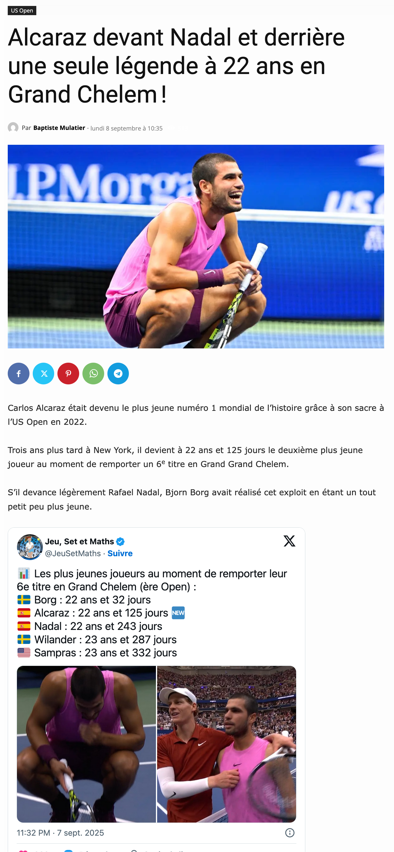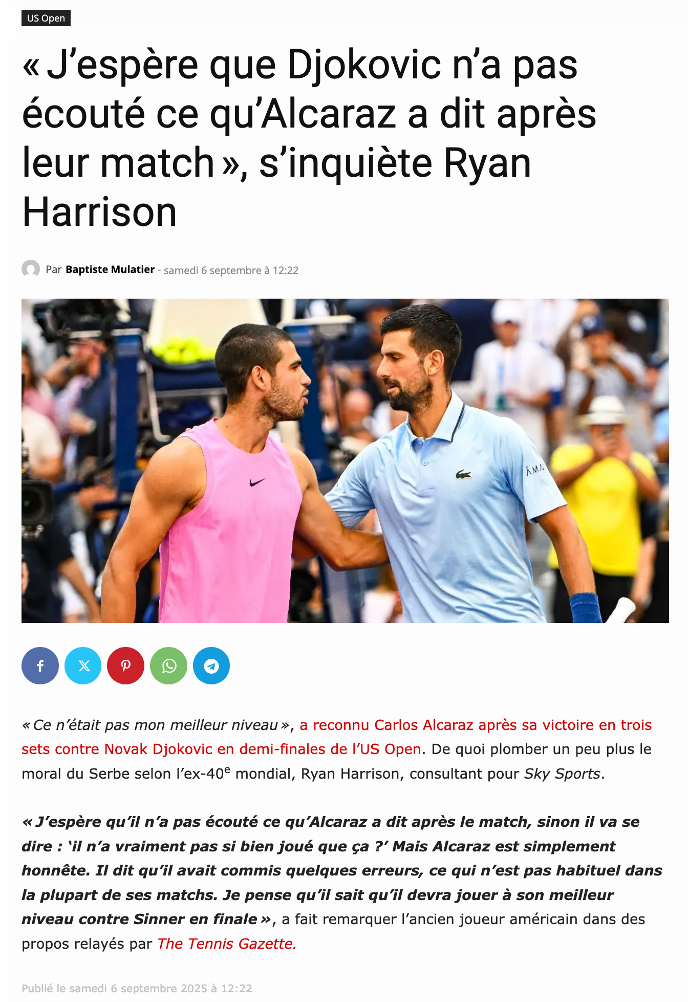 Carlos Alcaraz a gagné l'US Open. Personnellement, je pense qu'il est plus fort que Jannik Sinner, car beaucoup plus créatif et versatile. J'ai été surpris par le résultat à Wimbledon, mais après avoir vu la finale à Cincinnati, j'étais sûr qu'Alcaraz remporterait le titre ce soir.
