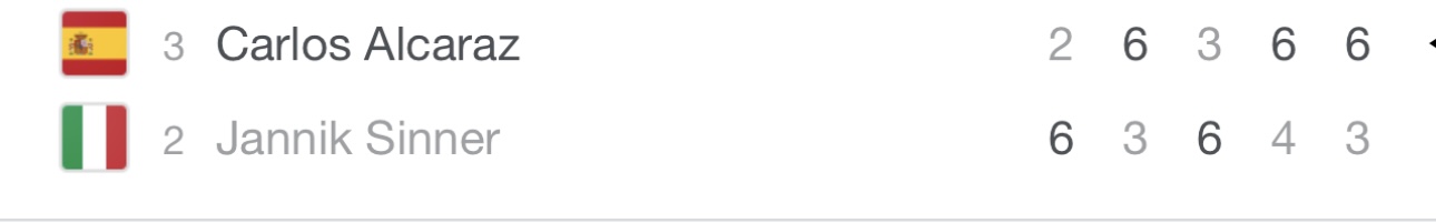 Ils sont à 4 - 4 en terme de confrontations !!! Donc c'est simple je pense que sur le papier Sinner devrait gagner mais si Alcaraz joue au niveau de Wimbledon l'an dernier, il va le trucider.