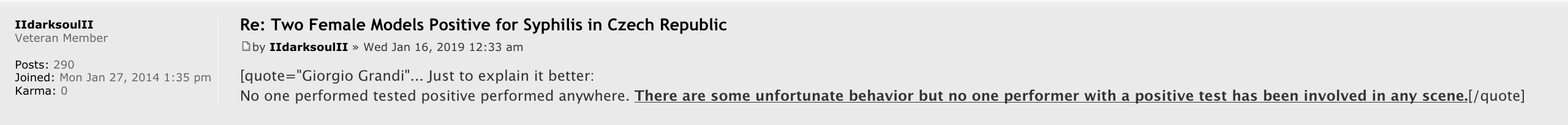 Both have been tested syphilis positive in december but NOBODY from the company or the girls themself have said anything in order to protect this industry from the chaos.